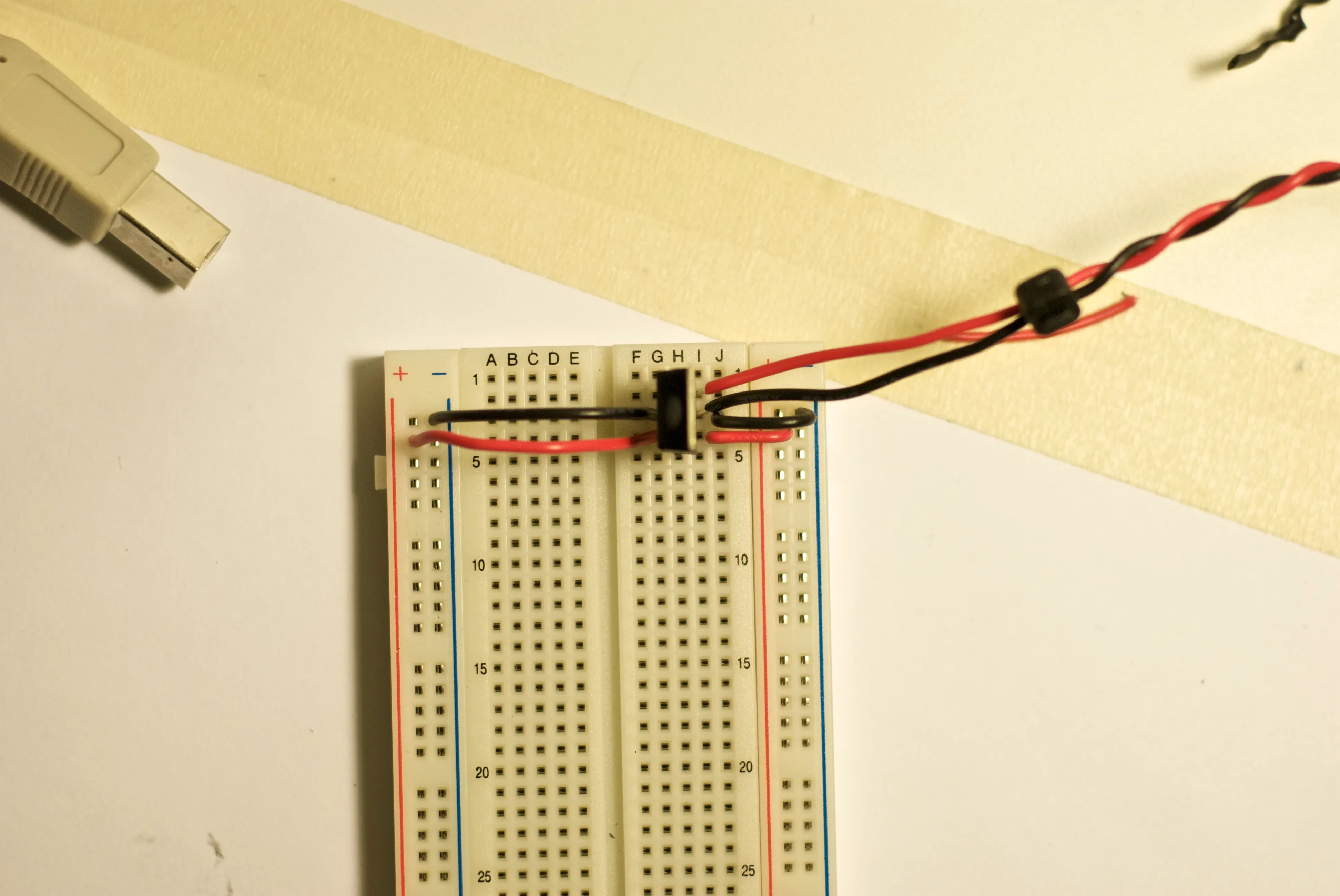 I set up a threshold value to decide whether the jumpy analog signal coming in from the photoresistor represented a hand. Finding the correct threshold value for different lighting conditions was a problem. Ideally, the threshold should be just below (e.g. darker) the number representing the ambient light hitting the photo sensor. Ambient light levels change, though, and the exact threshold has a big influence on the sensitivity of the system and how accurately it counts fingers. Again, I tried out some averaging algorithms to see if the code could learn about the ambient light levels in a particular room. Execution was problematic, though, so in the interest of time I ended up adding a potentiometer to the circuit so the threshold can be set manually as conditions change.